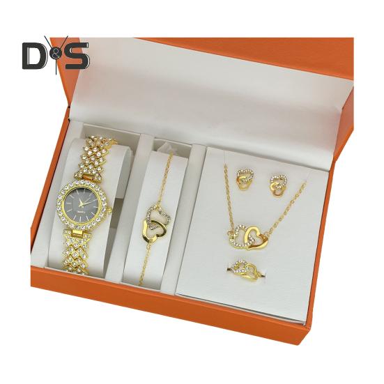 1 комплект женских украшений в подарочной коробке, полная коллекция кварцевых часов, ожерелья, браслета, колец, серег, комплект золотых украшений со стразами чёрный