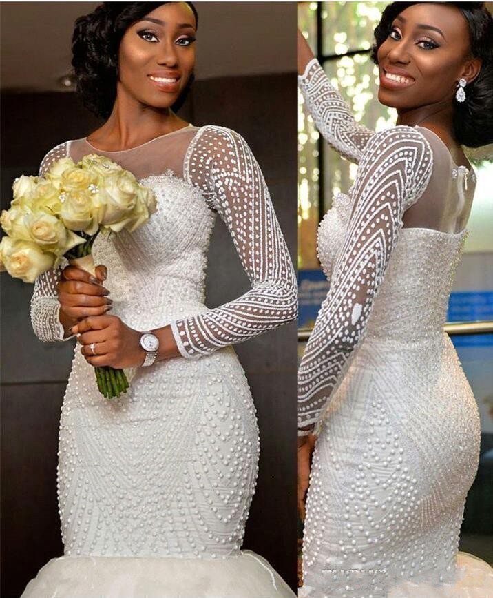 2018 Bling African Nigeria New Mermaid Wedding Dresses Jewel Neck Long Sleeves Crystal Beaded Pearls Sweep Train Custom Formal Bridal Gowns, Ivory