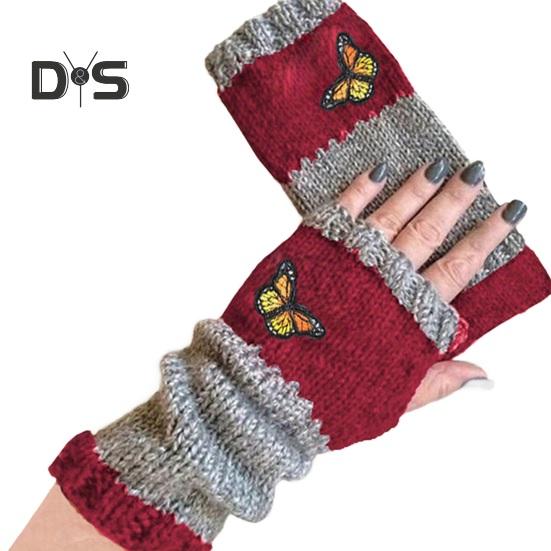 1 пара перчаток осень-зима без пальцев вязаные с вышивкой в виде бабочек высокоэластичные нескользящие рукава цветные нарукавники сохраняют тепло ветрозащитные вино красного