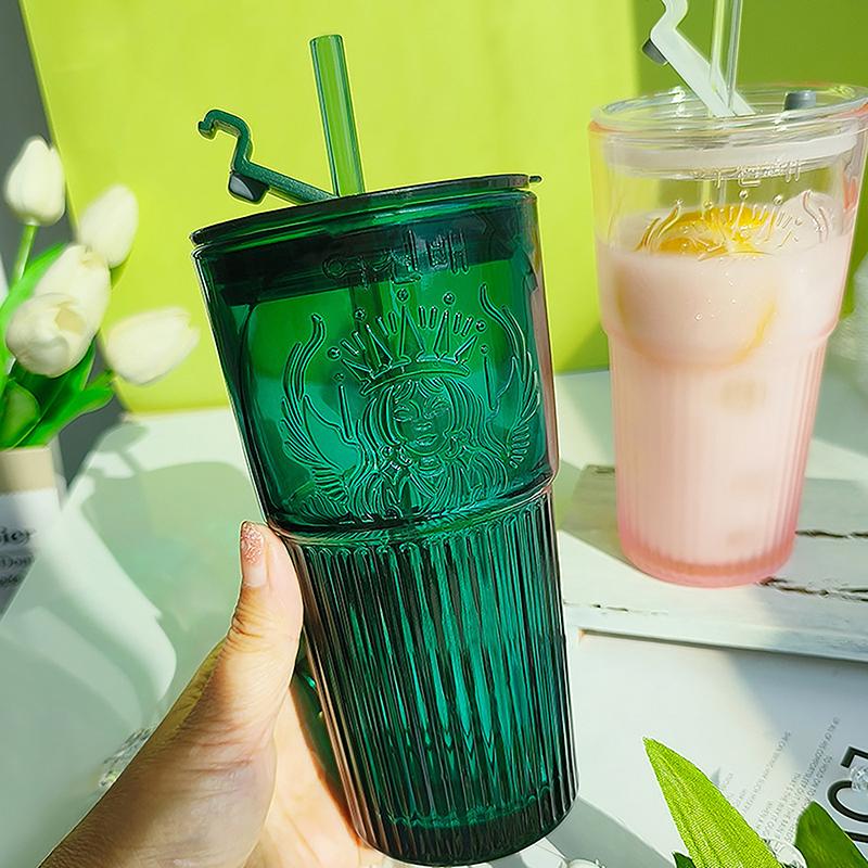 1 шт. Большая емкость 600 мл, стеклянная чашка для кофе с трубочкой, темно-зеленая модель «Богиня», летняя чашка для воды с крышкой и трубочкой 90*170 мм зелёный