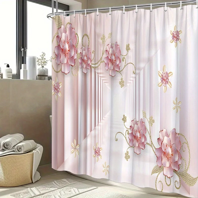 1 шт. Занавеска для душа с розовым цветочным принтом — золотая филигрань, мягкая пастель, 70,8x70,8 дюйма, 12 крючков, полиэстер