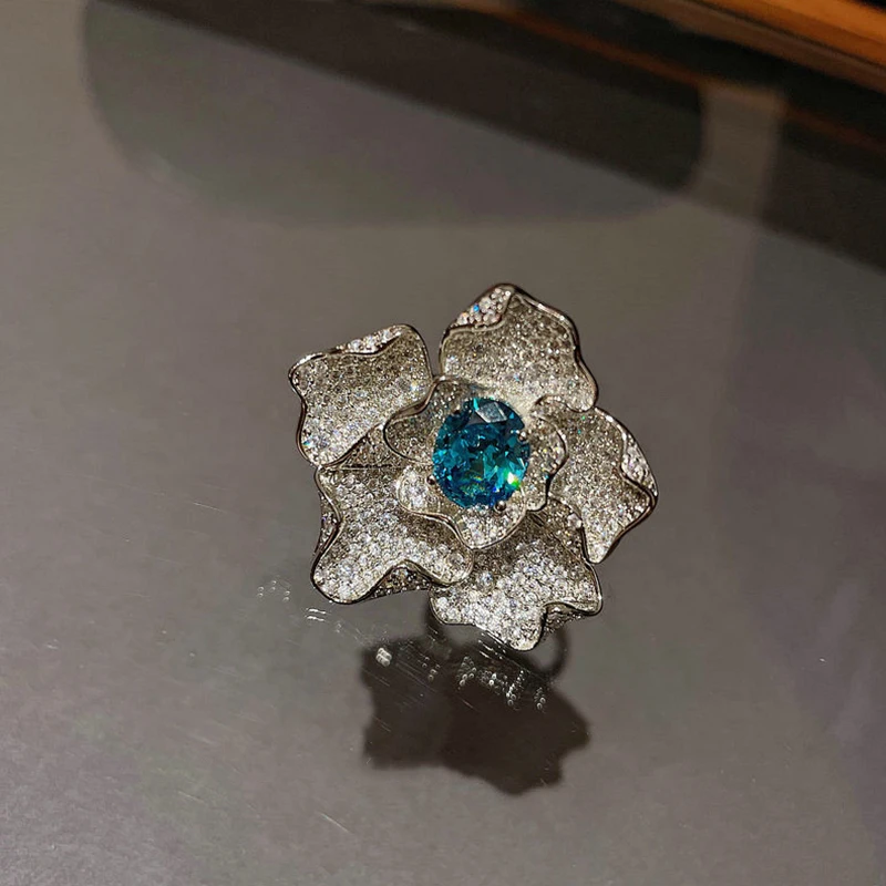 Bling Big Flower 925 Sterling Silver Exaggerated Blue Crystal Temperament Fashion Gift Female Opening Rings Prom Luxury Jewelry