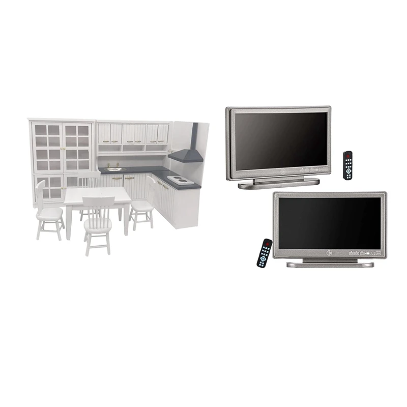 1/12 мебель для кукольного домика с современным ощущением, белый кухонный шкаф, стол в комплекте с 2 миниатюрными телевизорами 1:12 для кукольного домика