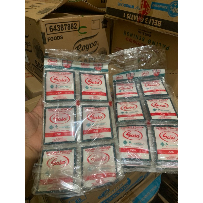 Sasa micin penyedap makanan 1 paket isi 5 lembar, setiap lembar berisi 6 pcs penyedap makanan.