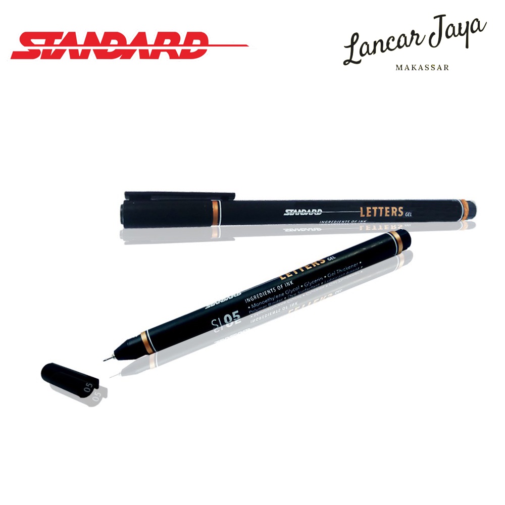 >Standard pen Letters SL05 Black dengan jenis tinta Gel / H2O , Tip Point 0.5 mm dilengkapi Tinta Warna Hitam. Lembut & Enak untuk Menulis dan ringan untuk digengam membuat tulisan lebih rapi.