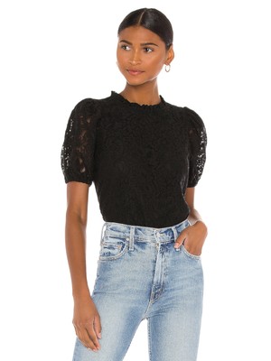 1. Женский черный кружевной топ с оборками и цветочным принтом с круглым вырезом STATE