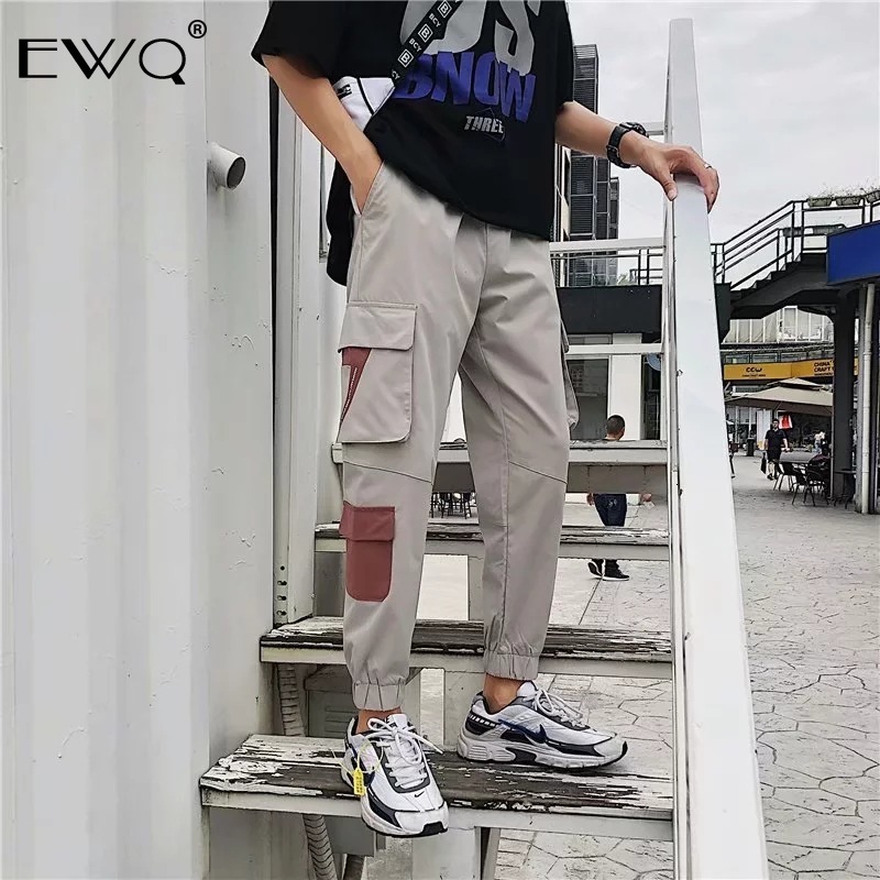 EWQ 2019 New Fashion Autumn Loose Hip Hop Streetwear Fide Pants Men Pockets Casual Drawstring Pantalon Deportivo Hombre FT201, Black
