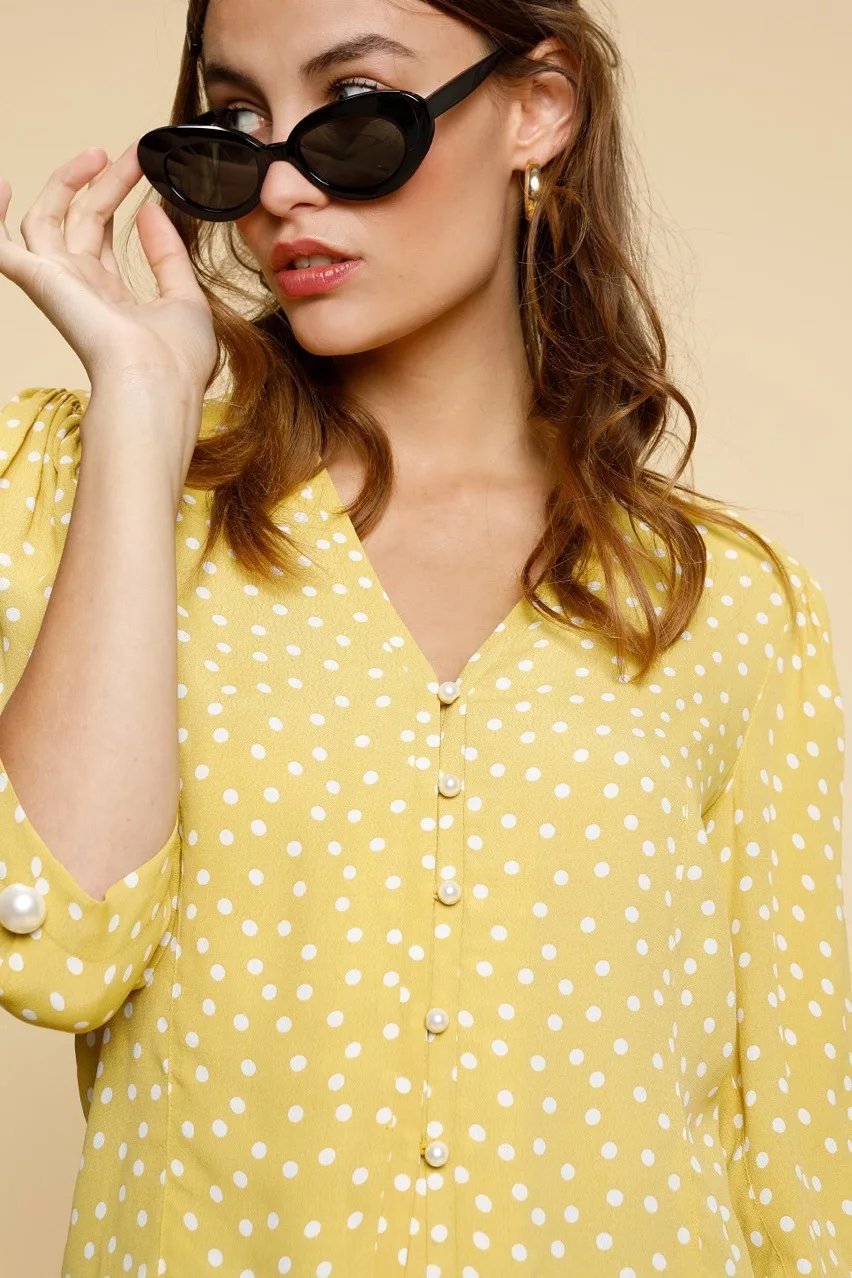 Женская рубашка в горошек, темно-желтая рубашка в стиле ретро, с жемчужной пряжкой, в французском стиле, Ранняя весна 2019
