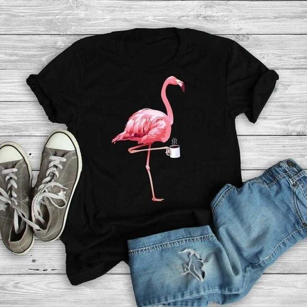 flamingo coffee print t shirt women short sleeve o neck loose tshirt summer women tee shirt camisetas mujer x0527, White