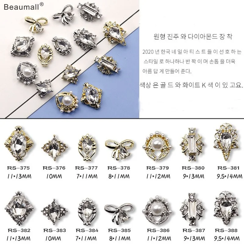 10 шт./лот, 3d дизайн ногтей, элегантный дизайн, Золотой/Серебряный сплав с жемчугом, кристаллами, стразами, Типсы для ногтей, красота