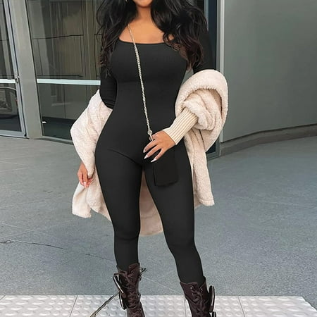 Dasayo Black Comfy Jumpsuits for Women Jumpsuits for Women Long Sleeves Solid Color Square Collar Sports Elastic Pants Romper Pants