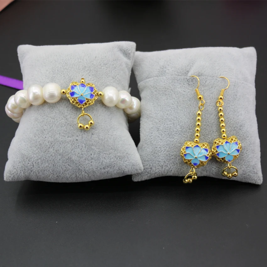 10-11mm natural white freshwater pearl beads bracelets gold-color cloisonne dangle earrings women diy jewelry set 7.5inch B3102