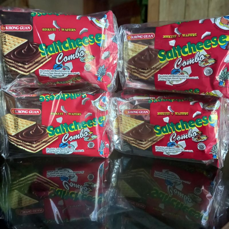 Khong guan biskuit + wafers saltcheese combo. Biskuit rasa keju lapis krim cokelat dengan wafer cokelat.