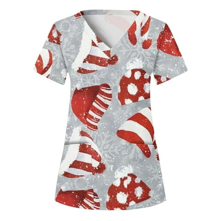Christmas Print Working Uniform Lady Womens V Neck Short Sleeve Tops Print T Shirt Casual Workwear Tops Scrubs Uniform Nurses