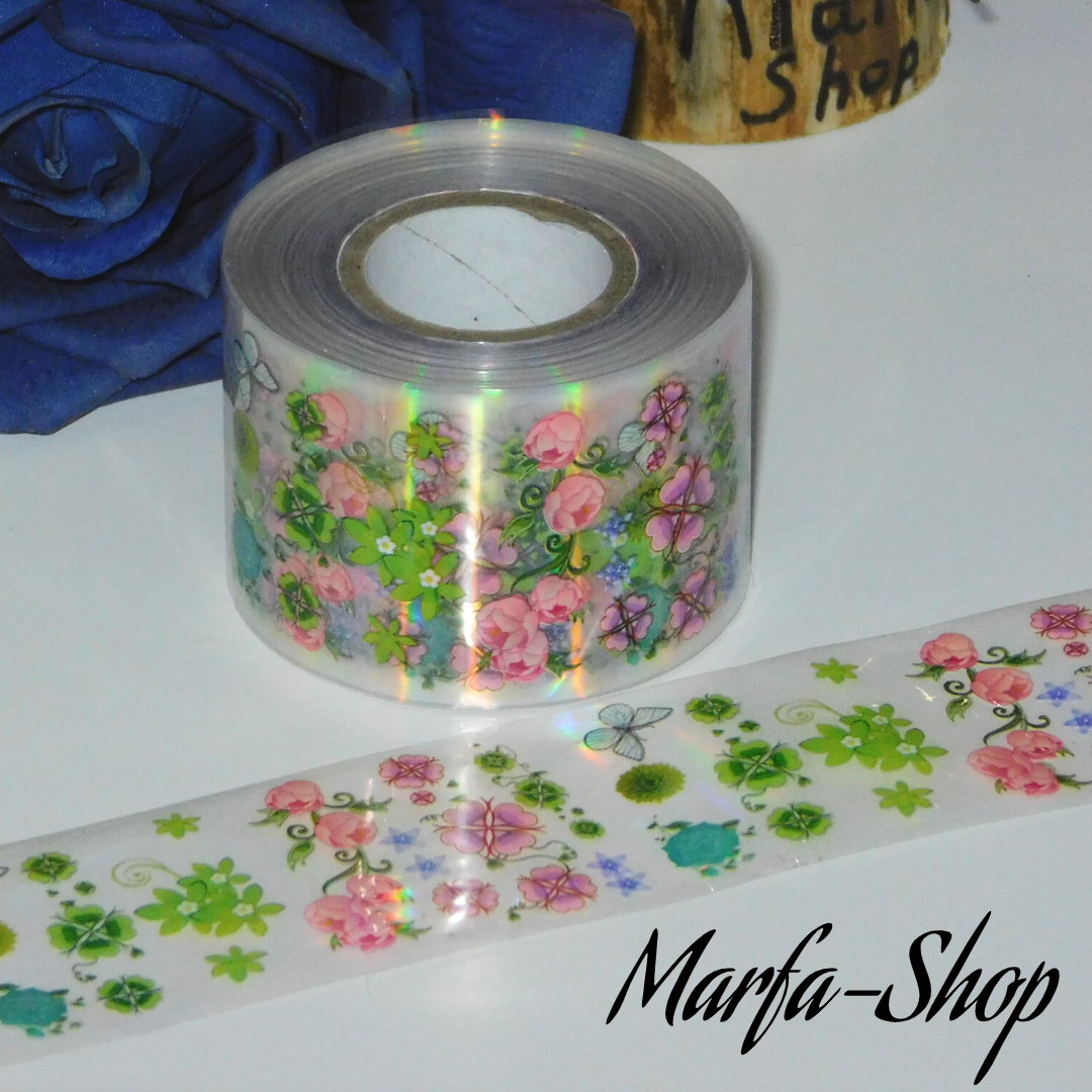 Фольга для ногтей цветы зеленых и розовых оттенков, тип 3-2
