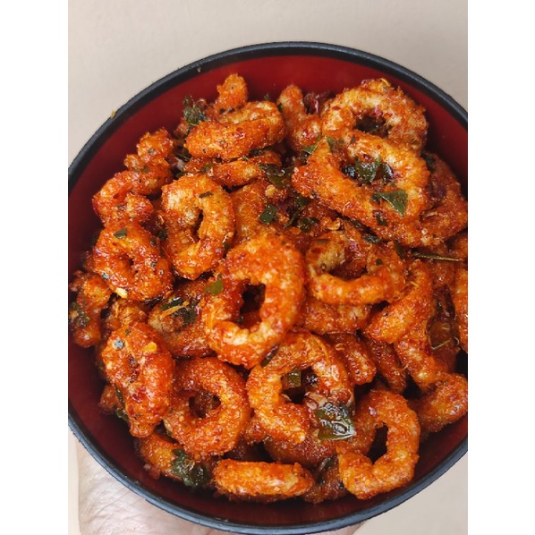 Cincin udang terbuat dari udang dan tepung dengan tekstur yang sangat renyah. Cincin udang di toko kami di bumbui dengan menggunakan bumbu rempah yang khas seperti cabe rawit (asli), minyak sayur, garam, dll. Bastik yang kami produksi memiliki 2 varian rasa (pedas daun jeruk dan original daun jeruk). Perpaduan rasa yang khas seperti pedas, gurih dan asin sangat cocok dinikmati semuanya. Cincin udang bisa dikonsumsi sebagai cemilan, lauk dan untuk suguhan.