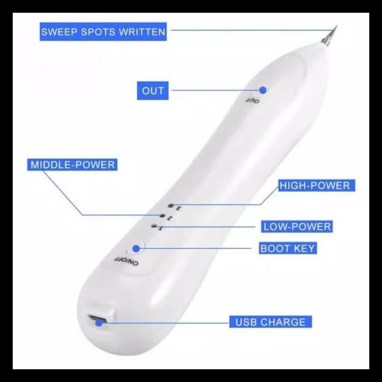 Laser pen ini bekerja dengan menimbulkan percikan listrik yang membuat area kulit yang hitam akan berkarbonasi dan menjadi berih dalam seketika. Dapat digunakan untuk membersihkan tahi lalat, black spot dan tato.