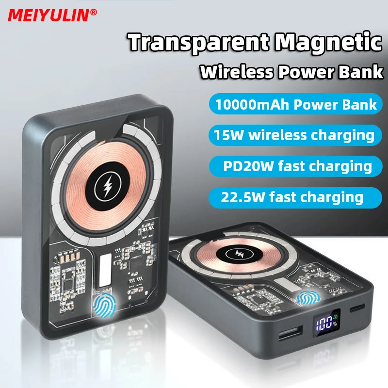 10000 мАч прозрачный магнитный беспроводной внешний аккумулятор 22,5 Вт USB C PD20W Быстрая зарядка внешний запасной аккумулятор для iPhone 15 14 Xiaomi