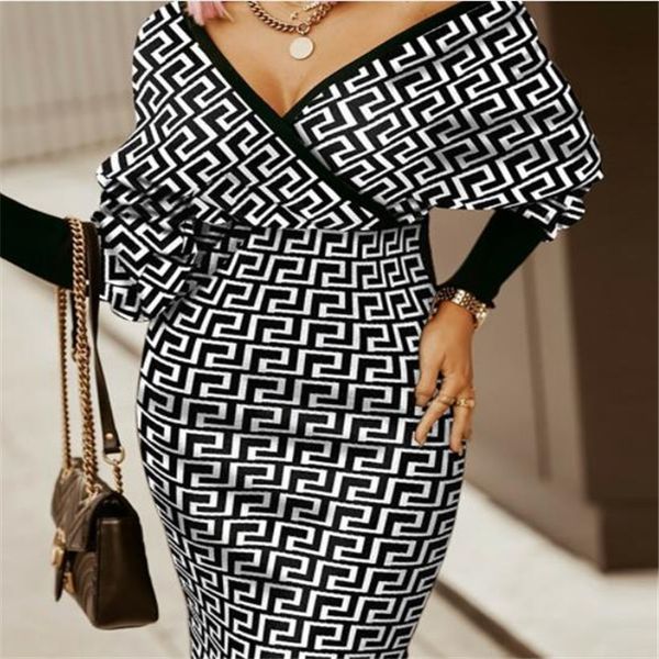 spring women's middle and long casual dresses polyester new v-neck geometric printing tight bag hip middle waist dress, Black;gray