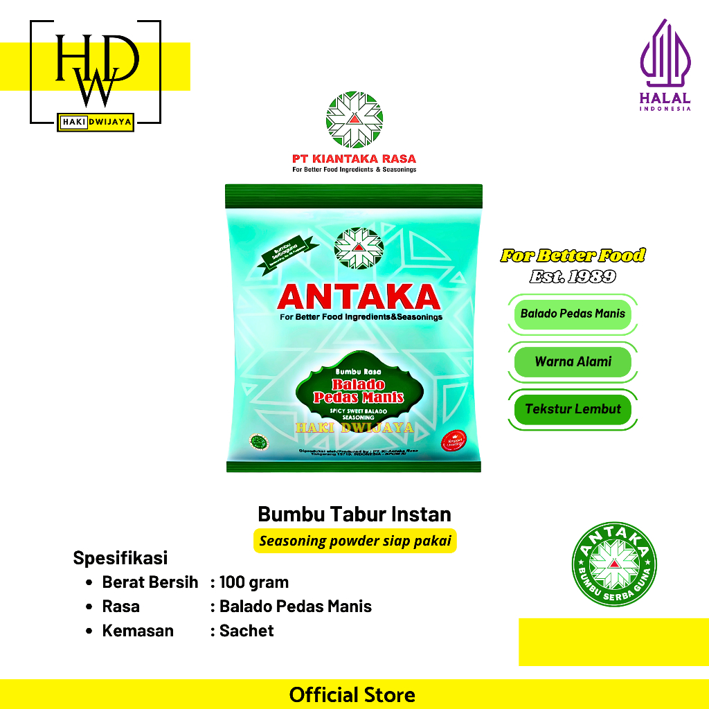 Bumbu Tabur Antaka adalah pilihan tepat untuk Anda yang ingin menambahkan cita rasa khas dan lezat pada setiap hidangan. Diracik dari bahan-bahan berkualitas tinggi dan diproses dengan standar higienis, bumbu tabur ini hadir dalam berbagai varian rasa yang menggugah selera seperti Balado, BBQ, Keju, Jagung Manis, Ayam Bakar, dan banyak lagi.