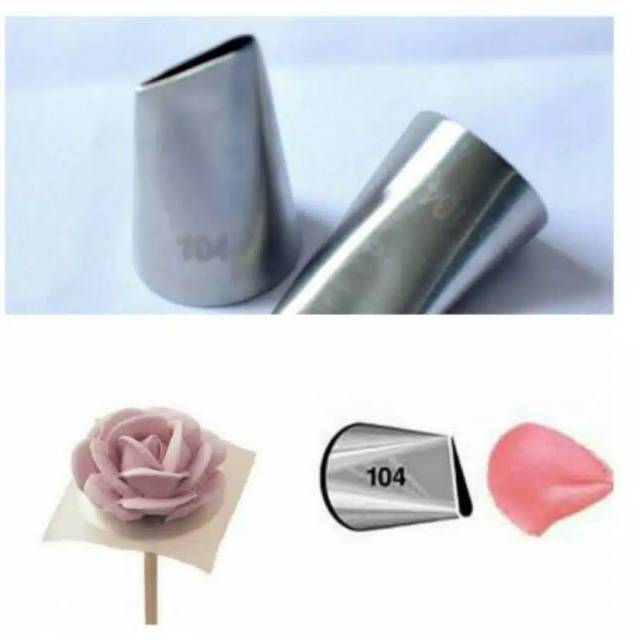 Spuit mawar 104 wilton China. Produk impor, tanpa sambungan. Bahan stainless steel tebal. Tinggi spuit 3 cm. Diameter bagian bawah spuit 1.8 cm Produk memiliki nomor serial