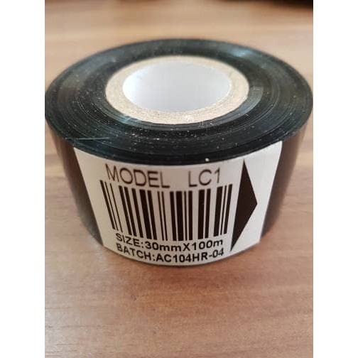 Hot stamping foill Ribbon Tape LC1 yang berkualitas dengan keunggulan warna hitam yang terang dan tahan lama. Ribbon Tape adalah tinta/pita yang digunakan untuk mencetak kode produksi atau expired date pada kemasan makanan, minuman, kosmetik, produk farmasi dan lain-lain. Biasa diaplikasikan dengan mesin Coding type HP-241, HP 241B, HP 351, dy 8, dll.