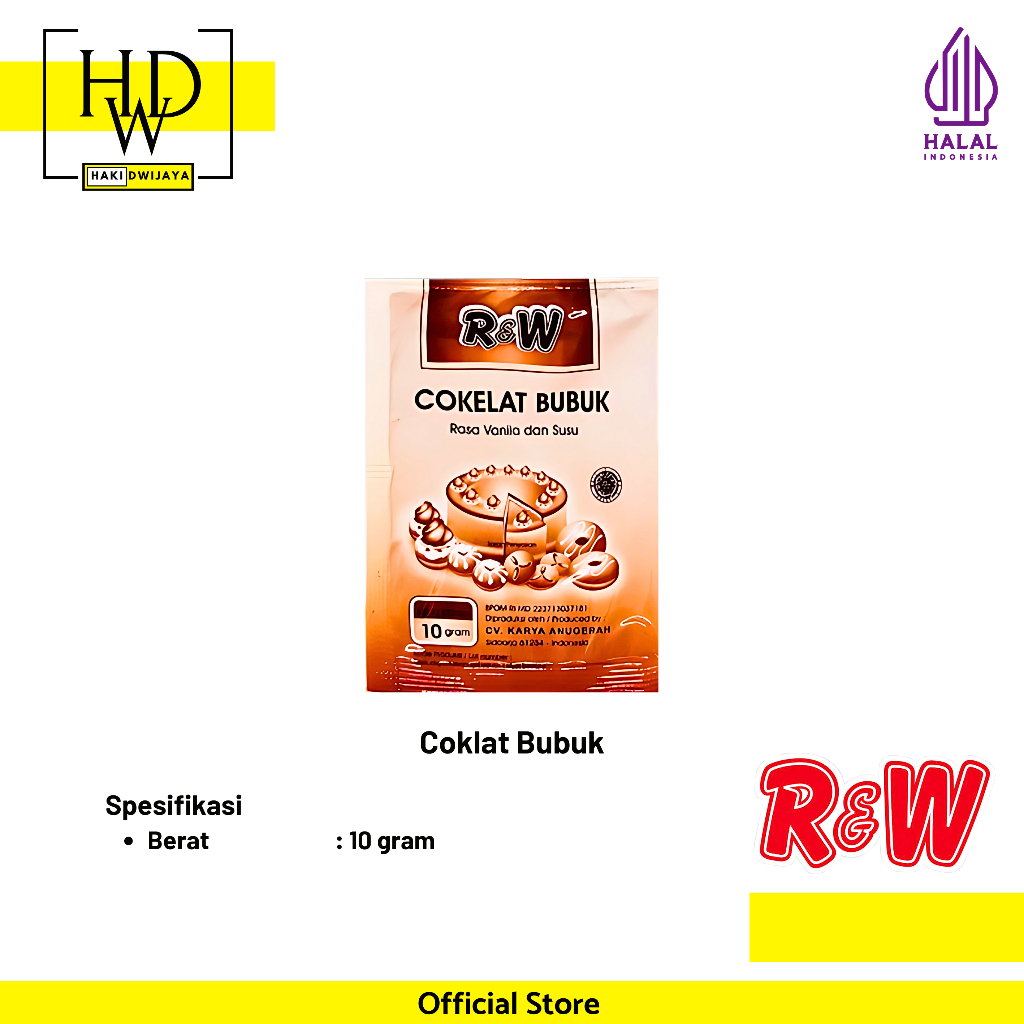 Coklat Cokelat Bubuk Rajawali R&W RW memiliki Kegunaan Untuk memberikan rasa coklat pada roti, kue dan minuman. Terbuat dari 97% cocoa Powder atau coklat bubuk murni dan 3% rasa Vanila dan Susu sehinga coklat bubuk memiliki aroma wangi.