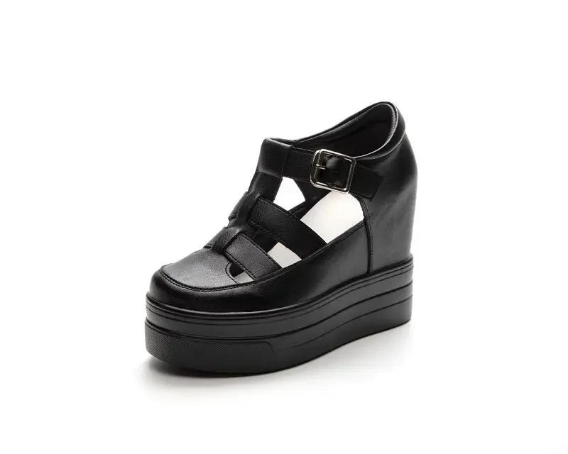 11 см Повседневная женская обувь, увеличивающая рост, натуральная кожа, сандалии с носками, римский стиль, полая толстая подошва, женская обувь 38 чёрный