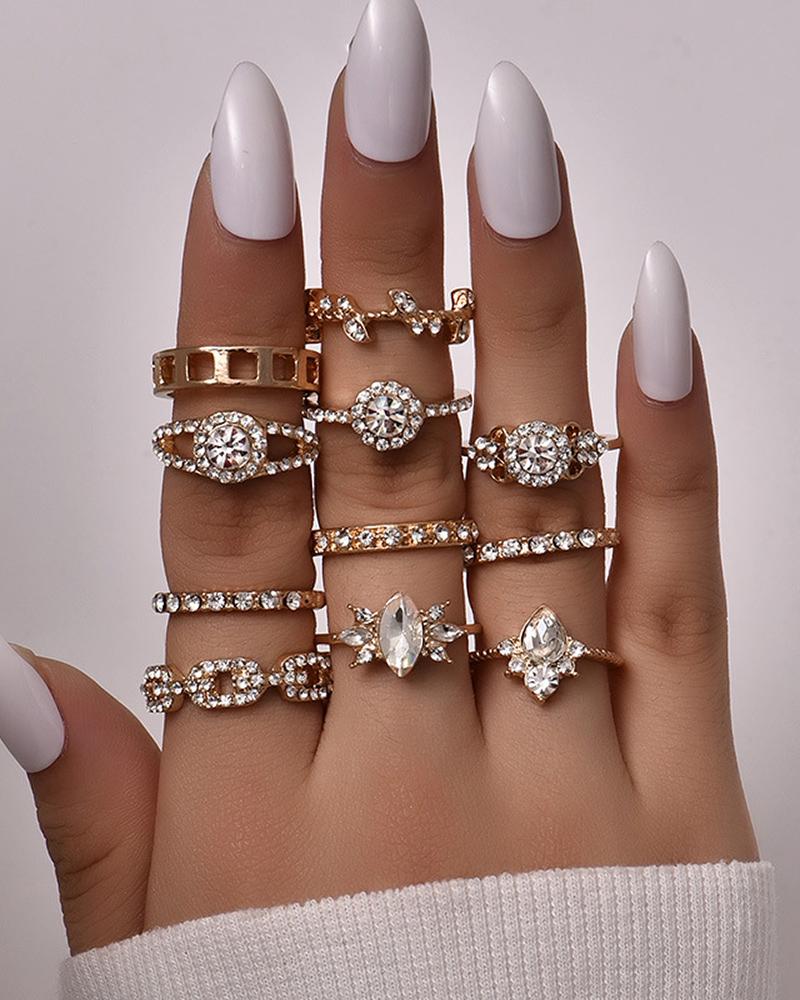 11pcs Fashionable Geometric Rhinestone Rings Set, Gold