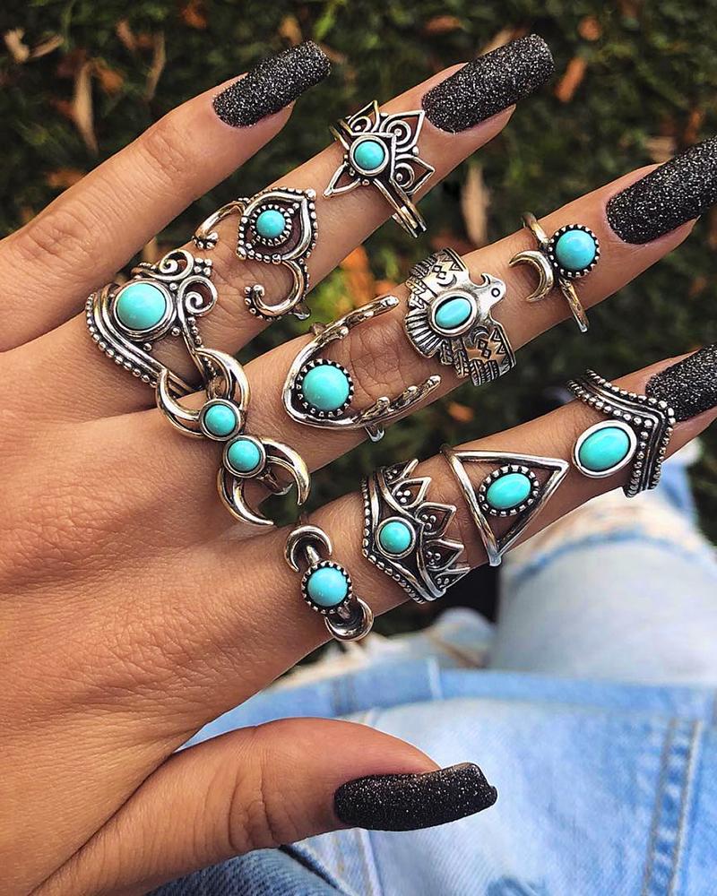 11pcs Graphic Animal Geometric Stackable Turquoise Rings Set, Blue