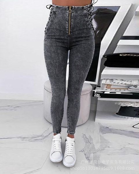 women's jeans fashion skinny capris dark grey 2021 autumn winter casual lace up decoration, Blue
