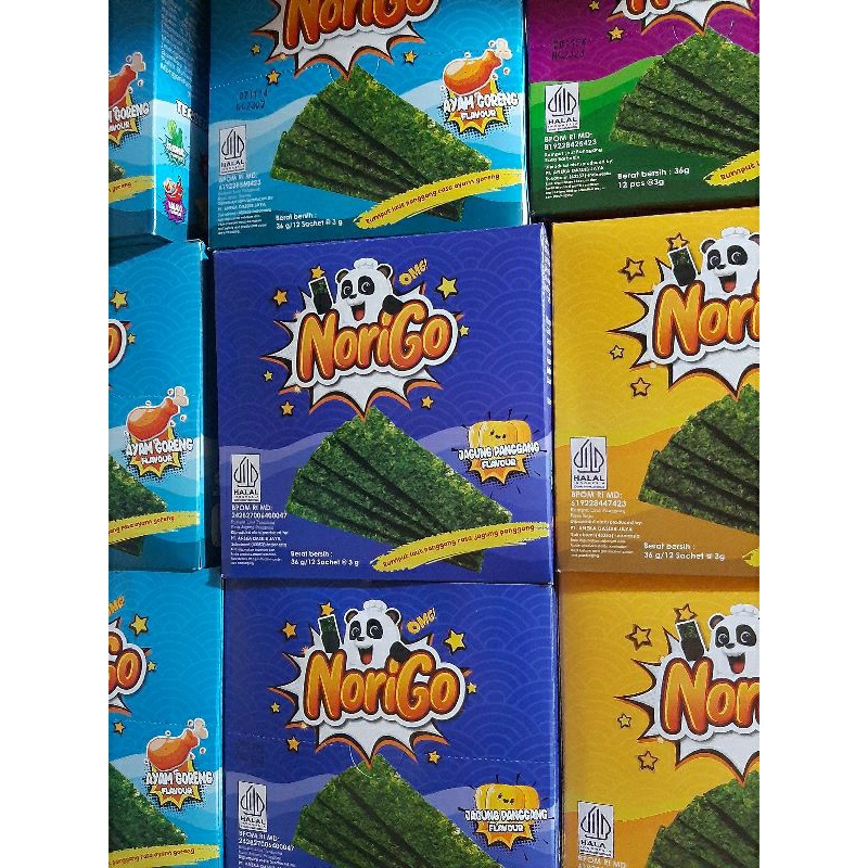 Rumput Laut Panggang Norigo all varian rasa, 1 Box isi 12 Sachet x 3 gram.