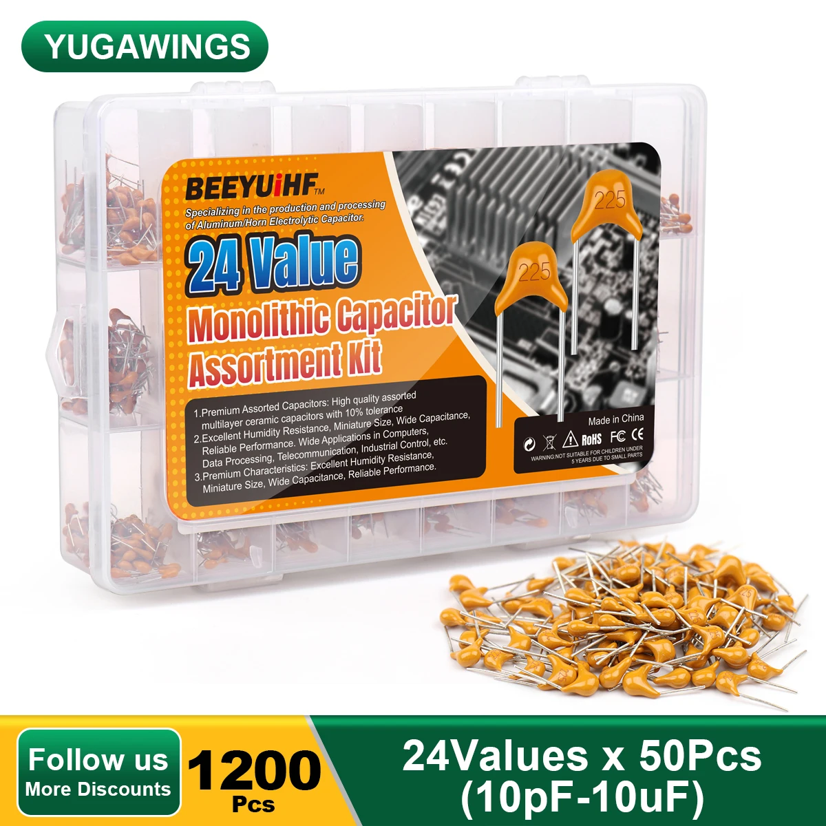 1200 шт. Yugawings монолитная керамическая лампа 0,1 мкФ 0,22 мкФ 0,33 мкФ 0,47 мкФ 1 мкФ 2,2 мкФ 10 мкФ 10 пф-10 мкФ 24 значения