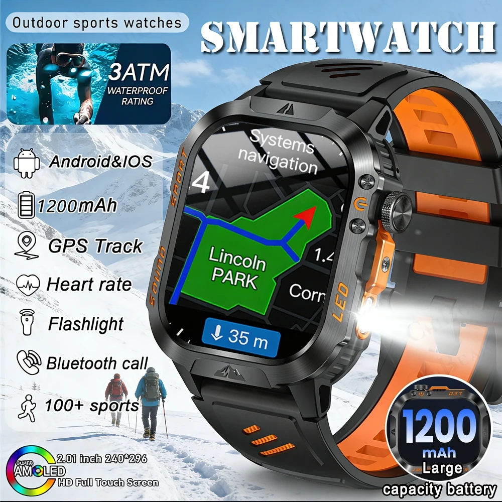 1200mAh Extra Large Outdoor Military Rugged Smart Watch With SOS Signal Light LED Flashlight 100+Sports Modes 2.01‘’AMOLED Watch