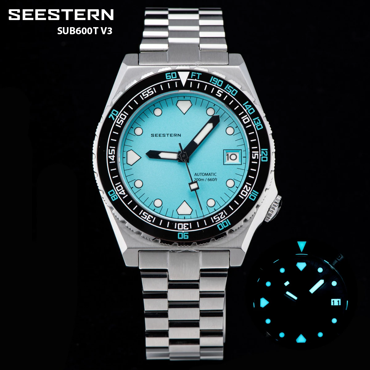 SEESTERN Diving Men Watch SUB600T Automatic Mechanical Sapphire Luminous Date 200m Waterproof Jubilee Bracelet Wristwatch Retro