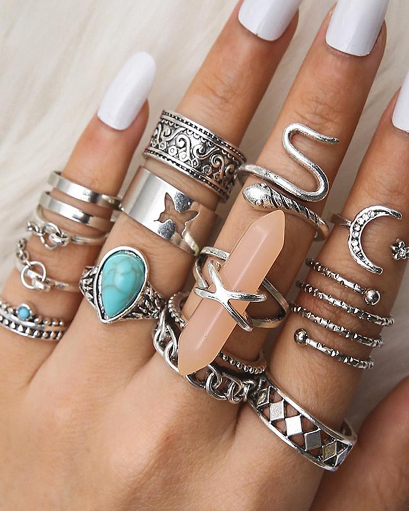 12PCS/Set Bohemian Turquoise Snake Shaped Geometric Quartz Hexagon Column Rings, Silver