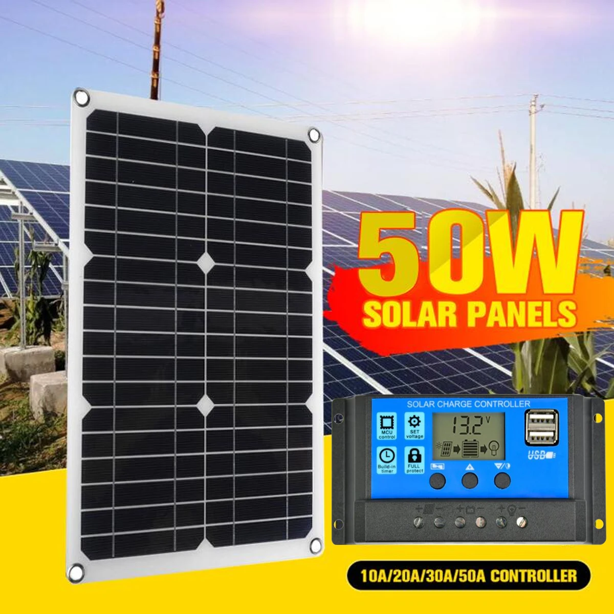 12V 50W Protable Solar Panel Kit 2 USB Port with 10A/20A LCD Display Solar Charge Controller Off Grid Monocrystalline Module