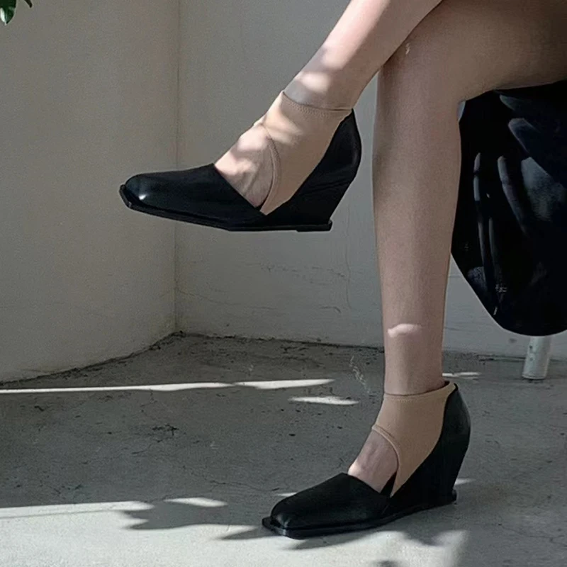 Design Mary Jane Single Shoes 2023 Autumn New Fashion Square Head Elastic Splicing High Heels Women Wedges Shoe Sexy Pumps