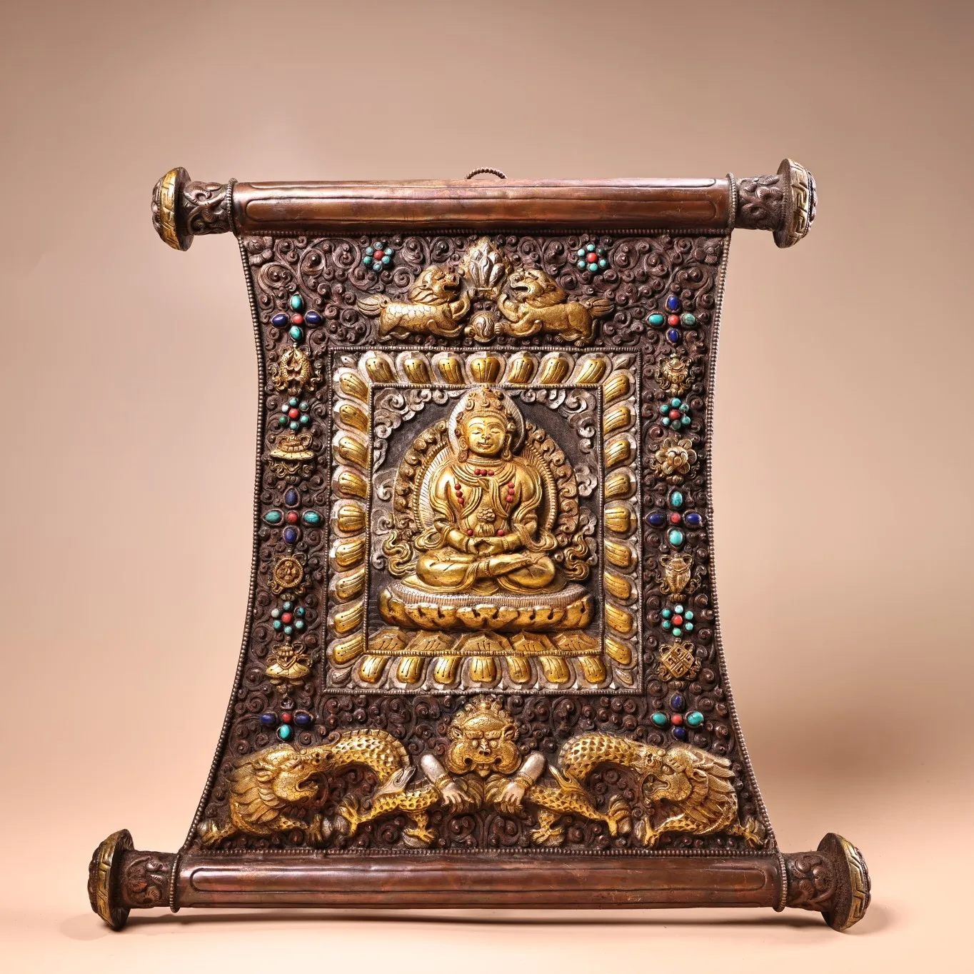 14-дюймовая коллекция тибетских храмов, старинная бронзовая Позолоченная серебряная мозаика, драгоценный камень, мандала Thangka, поклонение в зале, городской домик