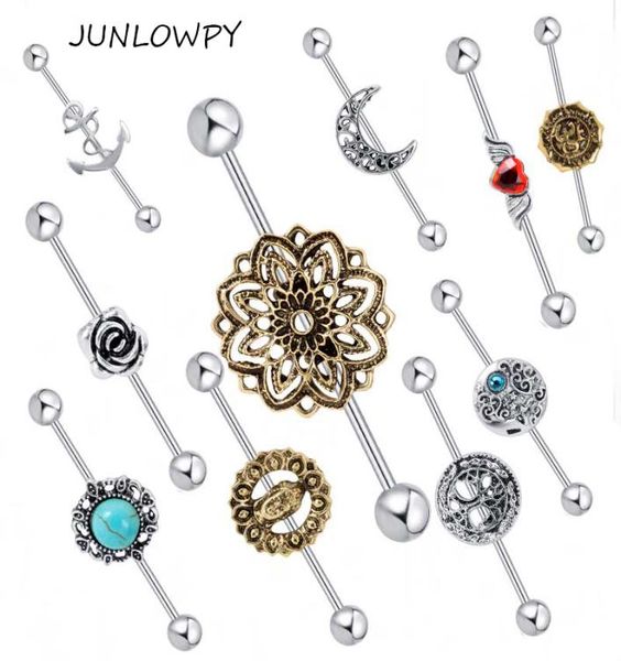 14g 38mm hollow moon anchor rose industrial barbell bar ear ring body piercing jewellery new style 20pcslot9963926, Silver