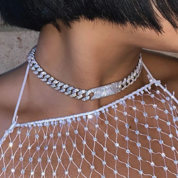 15" 16" wide heavy curb cuban link chain micro pave cz curve bar pendant necklace gold cool hip hop men women fashion jewelry, Silver