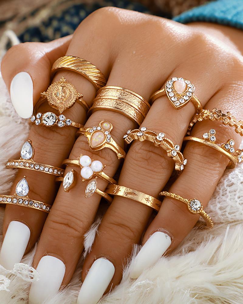 15PCS Beaded Studded Rings Set, Gold