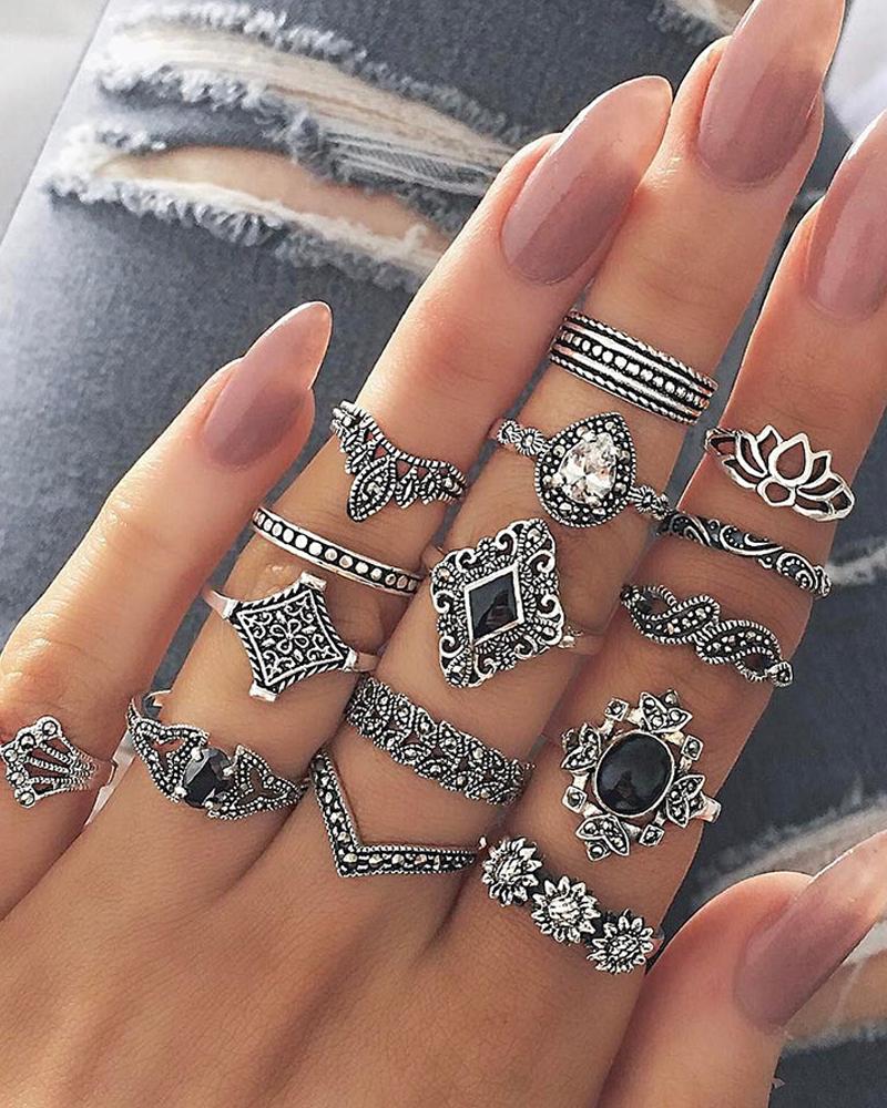 15PCS Rhinestone & Floral Pattern Rings Set, Silver