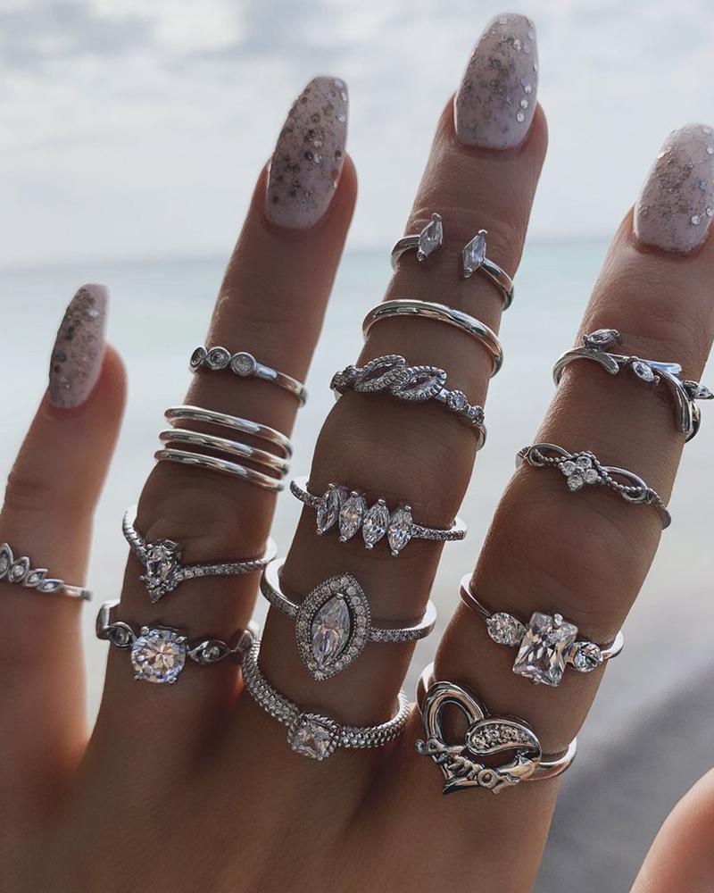 15pcs Stackable Rhinestone Leaf Heart Geometric Opening Rings Set, Silver