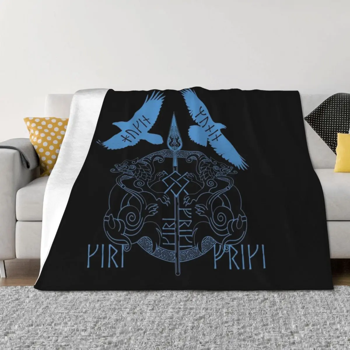 Norse Mythology Spear of Odin Gungnir Runes Geri Freki Huginn Muninn Blue Throw Blanket Sleeping Bag Polar Large Blankets