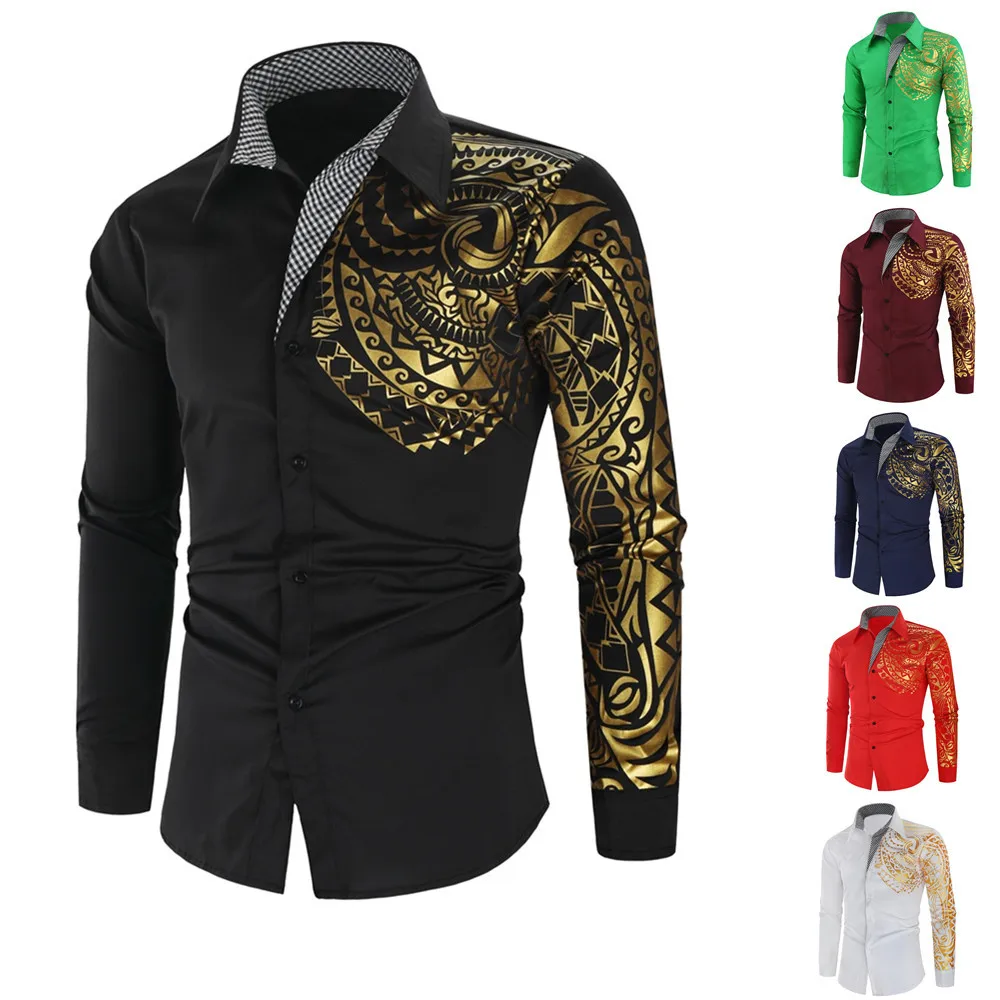 2021 на весну, лето и осень Кнопка золотистый и черный мусульманин рубашка для мужчин с длинным рукавом тотем, бронзовый принт размера плюс му...