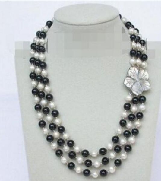 17"-19" 8mm 3row round white freshwater pearl black necklace, Silver