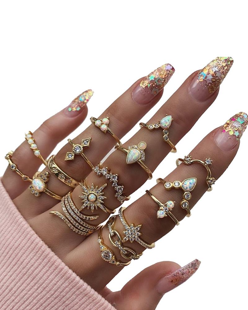 17PCS Studded & Beaded Decor Rings Set, Gold