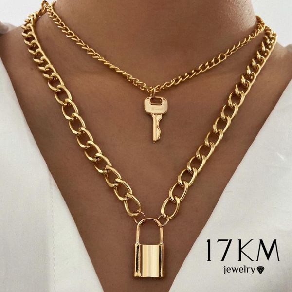17km trendy key lock pendant necklace for women men punk big chunky chain multilayed lock pendant necklaces jewelry party, Golden;silver