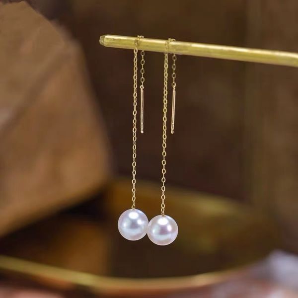 18k solid yellow gold (au750) women engagement drop earrings natural fashion lady jewelry girl japanese seawater pearl, Golden